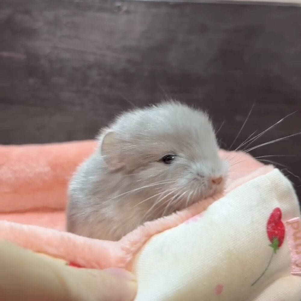 一人っ子で産まれました。足腰がしっかりしていて、早い段階でちゃんと歩けるようになりました。運動神経は良くて動く速度は早いです。といってもベビちゃんの中ではなので、簡単に捕まります。ケージの中ではけっこうのほほんとした顔してます。